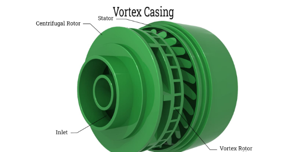該外殼是一個圓形腔室,位于外殼和葉輪之間。來自葉輪的流體必須先通過渦流室,然后再通過蝸殼。速度能量已轉化為壓力,與蝸殼相比具有良好的效率。